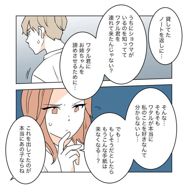 貸していたノートを返しに来たと聞いて「うちにショウマがいるのを知っててワタル君を連れてきたんじゃない?ワタル君にお姉ちゃんを諦めさせるために」とサクラは言いました。「そもそもワタルが本当に私のことを好きなんて分からないし・・・でも・・・もしそうだとしたらもうこんな手紙は来なくなる?」とカエデも考え込んでいます。「これを出してたのが本当にあの子ならね。」とサクラは言いました。