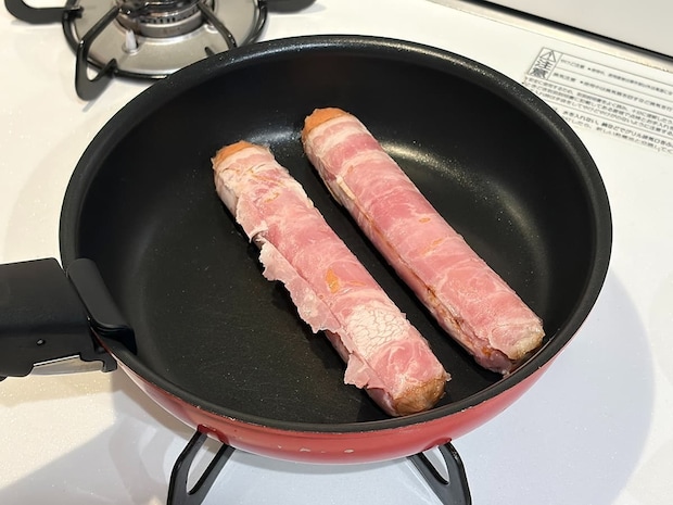 フライパンで焼き上げたソーセージがこちら。周りのベーコンに焼き色が付き、香ばしい香りも漂ってきて美味しそうです♪