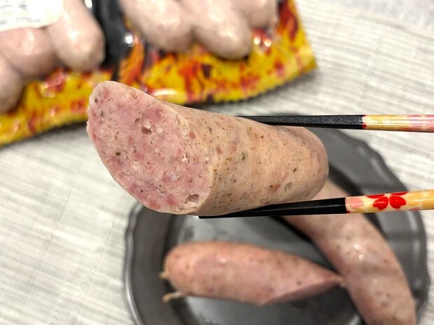 コストコのソーセージの中で見ると、サイズは少々短めではありますが、それでもスーパーのソーセージに比べると規格外!太さもあり、お箸で持ってみるとかなりの重量感がありました。