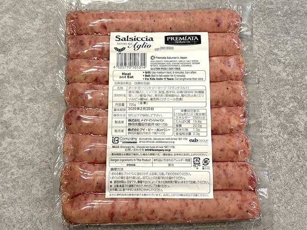 イタリアの伝統料理の1つであるサルシッチャは、肉に塩やハーブ、スパイスを加えて仕上げたソーセージを指します。パックにソーセージが8本、720g入って価格は1,598円(税込)。
