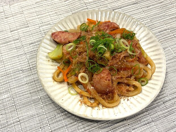 焼きうどんの和風な味付けにガーリックソーセージがプラスされることで、パンチのある味わいに!食べごたえも増し、満足感の高い一皿に仕上がりました♪