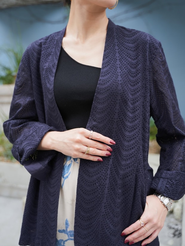 「ヌキテパのアーバンな商品ラインの中で、今季おすすめな春ジャケット。インドの伝統技法であるシフリー刺繍の中でも一段と細やかなカットワークで描かれた、草花がさざ波のように連なるレースが美しいです。袖は裏地が無く腕がかすかに透けるので、スタイリングがこなれた印象になります。ほどよいオーバーサイズがモダンで、カーデ感覚で羽織れるジャケットとしてオンオフ問わず重宝します。同生地のパンツも展開しているので、セットアップでシックにまとめるのもオススメです」ジャケット¥49,500(ヌキテパ/パサンド バイ ヌキテパ)