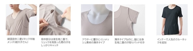 これを受け、リュックを背負った時などにできる汗に対応した背中部分が二重になっているインナーや、アウターに響きにくい薄手のメッシュ素材のインナー、Tシャツの襟ぐりギリギリまで汗をカバーするクルーネックタイプなどメンズ向けに3商品を新たに拡充し、男性特有の汗悩みにも応えていきます。