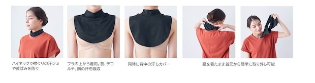2025年のシリーズ化以降、「汗を吸収してくれる」「汗をかいたらすぐ外せて楽」といった声が寄せられている「脱げるんジャー」シリーズからは、「脇背中」「背中」「胸」用の商品に加わる新商品として、襟ぐりの汗ジミや黄ばみを防ぐ「首用タイプ」が登場します。