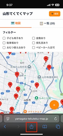 iPhone/iPadの場合は、Safariで山形てくてくマップを開き、共有ボタンをタップ。画像上では赤枠を参照(以下同)。