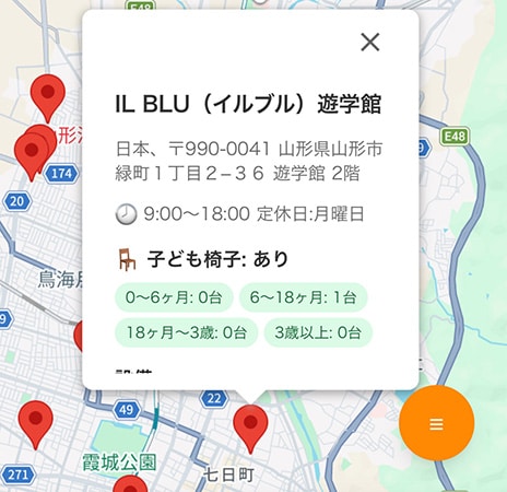 1つ目は、地図ベースの直感的な店舗検索が可能な点。Googleマップ上に店舗がピンで表示され、ピンをタップするだけで設備情報をその場で確認できる。スマートフォンでは片手での操作も可能で、外出先でも素早い検索が可能だ。