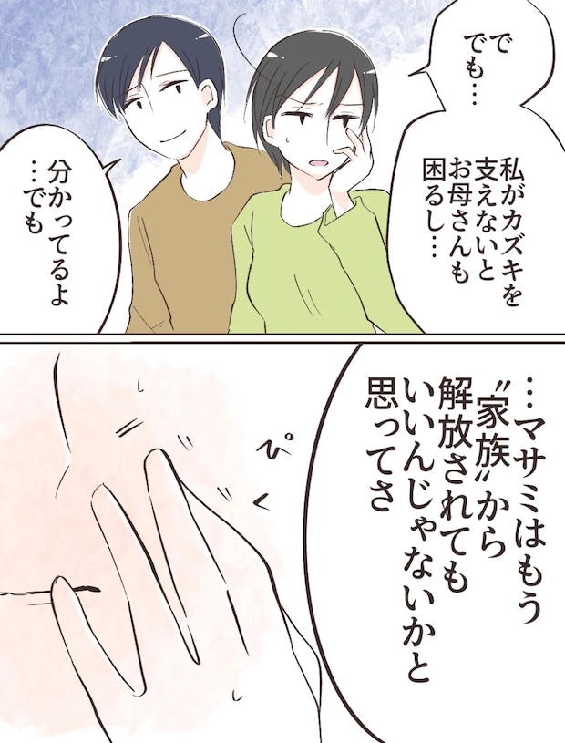 プロポーズとも受け取れる言葉に舞い上がりそうになるも、頭によぎるのは家族の顔。私は戸惑いながら「で、でも私がカズキを支えないとお母さんも困るし」と答えます。するとケイスケさんは「分かってるよ・・・でも、マサミはもう『家族』から解放されてもいいんじゃないかと思ってさ」と言いました。