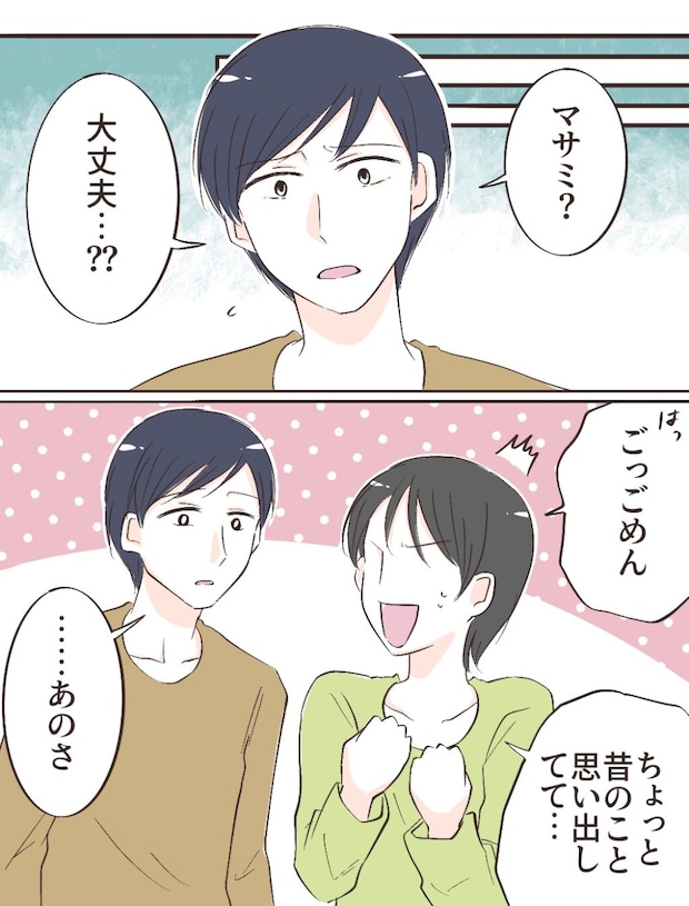 「マサミ?大丈夫?」ケイスケさんに声をかけられ、私はハッと我に返りました。「ごめん、ちょっと昔のこと思い出してて・・・」そう答えると、ケイスケさんは真剣な表情で「・・・あのさ」と切り出しました。