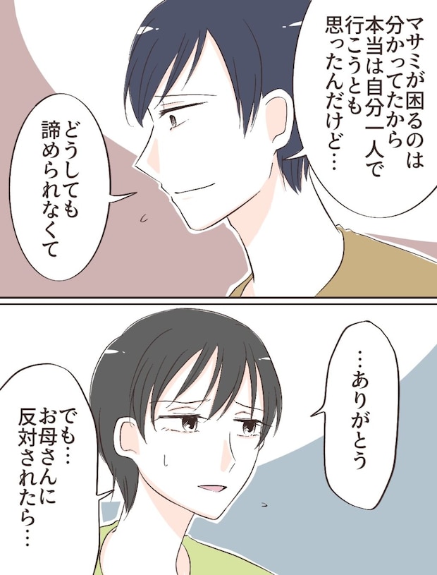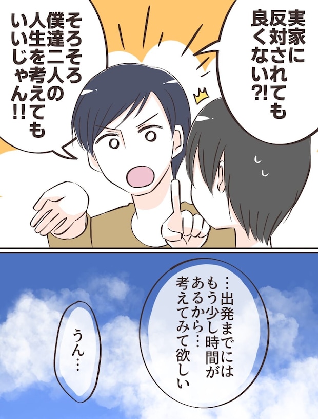 するとケイスケさんは「実家に反対されても良くない!?そろそろ僕たち2人の人生を考えてもいいじゃん」とキッパリ。「出発までにはもう少し時間があるから、考えてみて欲しい」そう言われて、私は複雑な気持ちを抱えながらも「うん」と答えました。