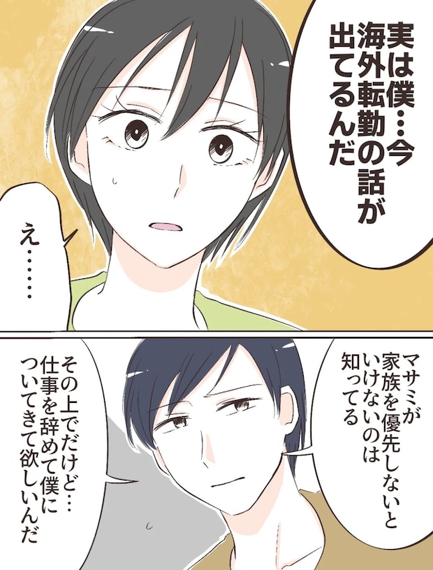 「実は今、海外転勤の話が出てるんだ」ケイスケさんの言葉を聞いて驚いた私は、思わず固まってしまいます。彼は続けて、「マサミが家族を優先しないといけないのは知ってる、その上でだけど、仕事を辞めて僕についてきて欲しいんだ」と言いました。