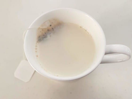 2. 茶葉は牛乳にはあまり成分が出ないので、ティーバックは牛乳に半分だけ浸かるように入れましょう。