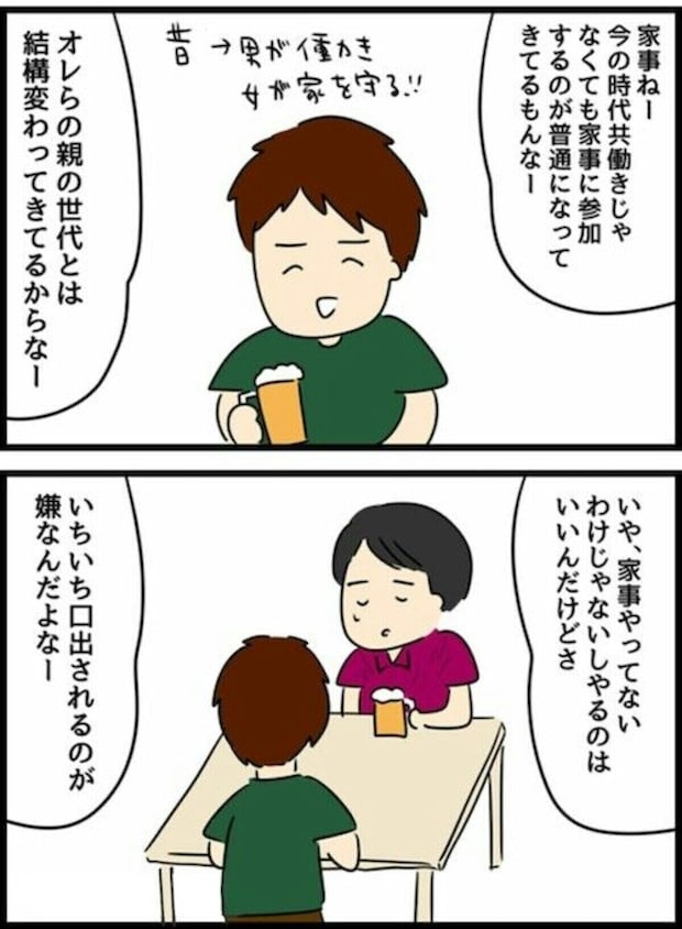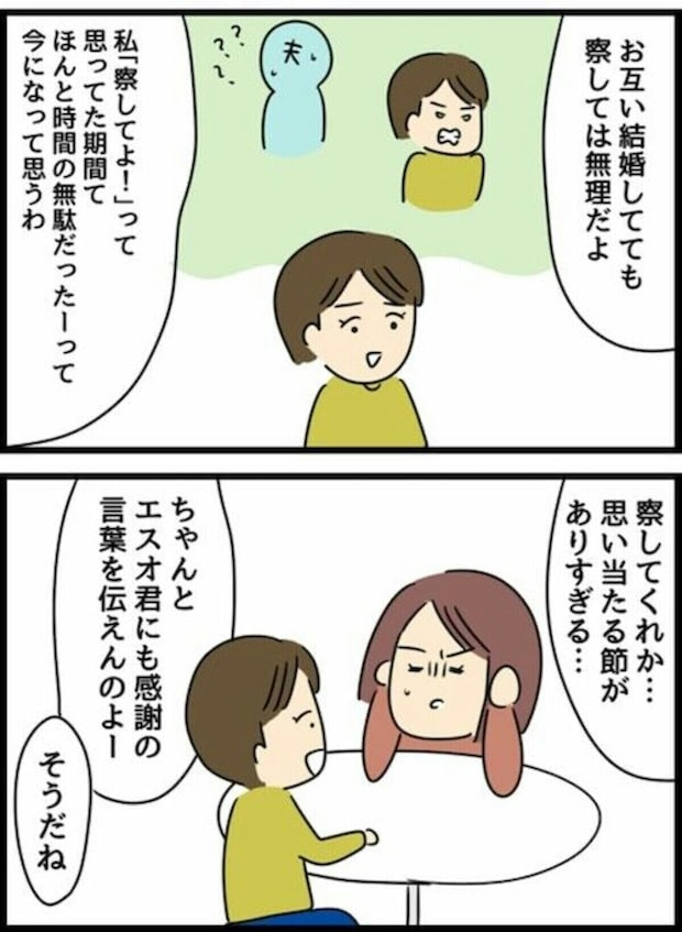 家事自体はイヤではないけど、いちいち口出しされるのがイヤなんだと友人に愚痴っていると、友人が語る、結婚生活の先輩としての言葉に目からうろこのエスオくん。