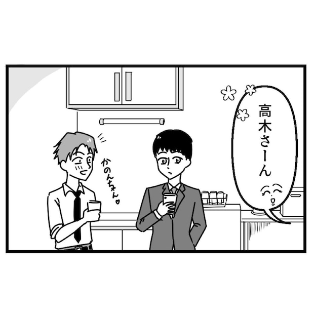 給湯室にいる光一に声をかけるかのん。光一と一緒にいる同僚は、かのんを見て鼻の下を伸ばしています。
