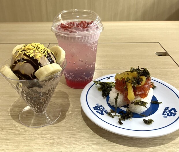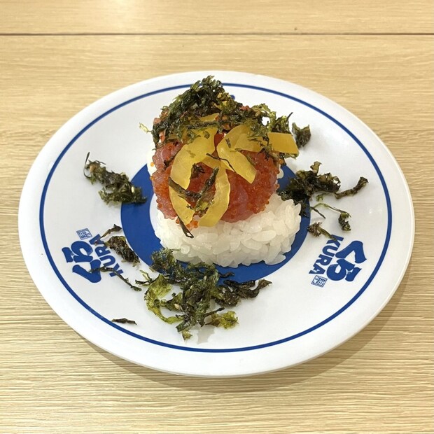 「BT21」が韓国発のキャラクターブランドであることから、韓国家庭料理のチュモッパをくら寿司流にアレンジ。とびこのプチプチ食感とたくあんの歯ごたえ、韓国のりがアクセントになっている。
