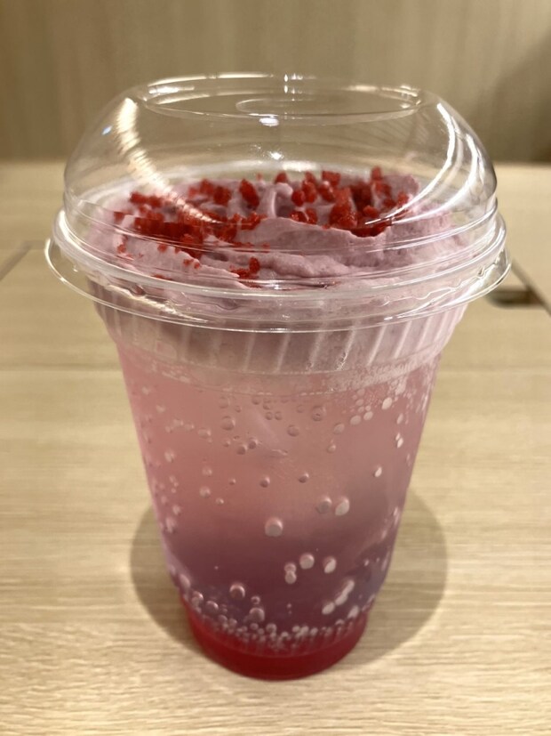 ピーチソーダにぷるぷる食感のサイダーゼリーを合わせ、ぶどうホイップをトッピング。ラズベリー顆粒の甘酸っぱさがアクセントになっている。