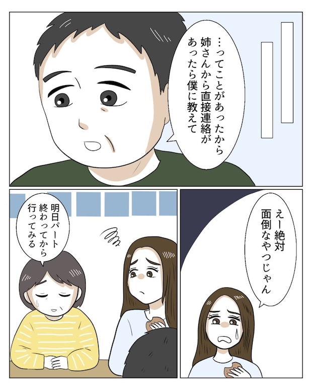 「・・ってことがあったから、姉さんから直接連絡があったら僕に教えて」和也さんの言葉を聞いて、「えー絶対面倒なやつじゃん」真矢がそう言った後、「明日パート終わってから行ってみる」と和也さんに言いました。
