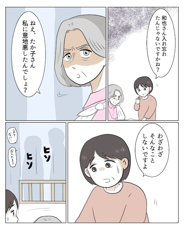 「和也さん入れ忘れたんじゃないですかね?」私がそう言うと、「ねえ、たか子さん。私に意地悪したんでしょ?」と突然言い出し、「わざわざそんなことしないですよ」とやんわり言い返すも、相部屋ではやりとりが筒抜け。隣で「え?なに・・」「なんだろ・・」と聞き耳を立てる声が聞こえました。