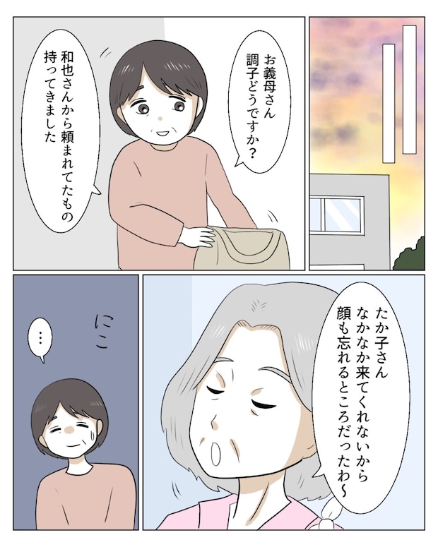 「お義母さん、調子どうですか?和也さんから頼まれてたもの持ってきました」私がそう言うと、「たか子さん、なかなか来てくれないから顔も忘れるところだったわ~」と嫌味をチクリ。私は何も答えず無言で笑顔を作りました。