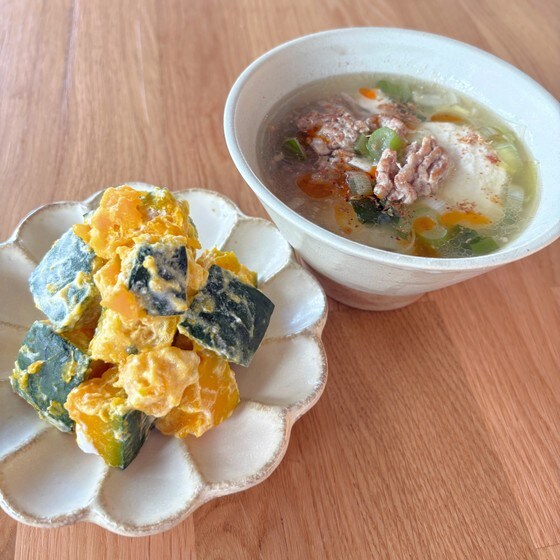 収録の際に試食した「かぼちゃのヨーグルトサラダ」(左)、「豚ひき肉と豆腐の塩麻婆豆腐風スープ」(左)。少ない調味料でやさしい味わいに