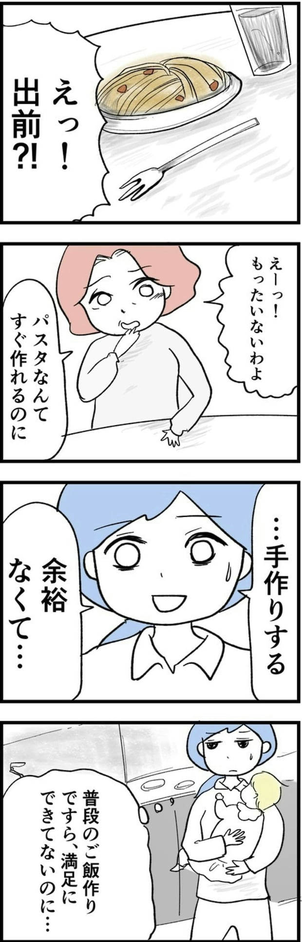 ある日、友人の貴美子を家に招いた日のこと。お昼ご飯の準備をしようとしたところ、突然、娘が泣き出してしまったのです。仕方なく、パスタの出前をしたのですが、貴美子は文句ばかり。