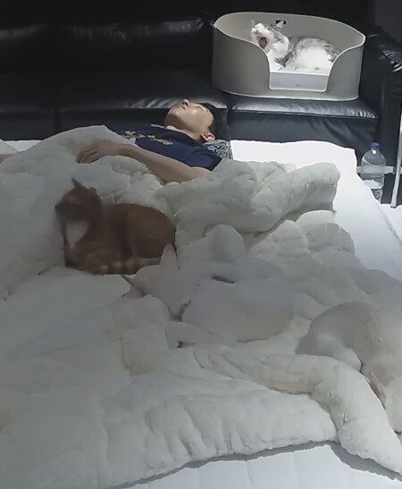 すぐに飼い主さんの足元で寝る猫さんと、