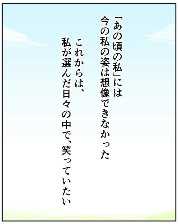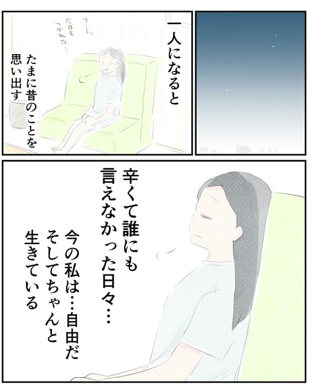 ゆうさんは、離婚をして新しいことに挑戦中です。ときどき、元夫のDVにおびえていた日々を思い出すことがあるものの、今は自由に自分の意思で生きていると実感しています。自分が選んだ日々の中で笑っていたい、と前向きな気持ちになったゆうさんを応援したくなりますね。