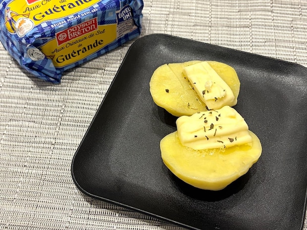 次に、熱々のじゃがいもにバターを乗せ、じゃがバターを作ってみました。