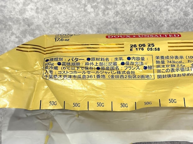 バターを包むパッケージ袋には、25gごとに目盛りが付いていました。料理でバター50gが必要なときも、計量不要で切るだけなのはとても便利ですね♪