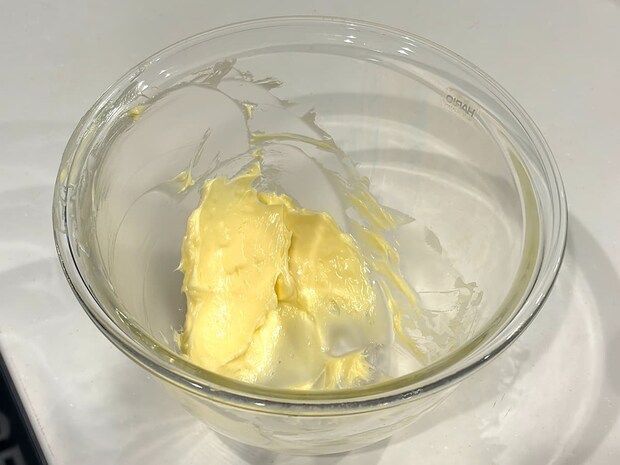 無塩バターを使って、まずはスコーン作りに挑戦します。はじめにバターを電子レンジで軽く温め、扱いやすい柔らかさにしておきます。