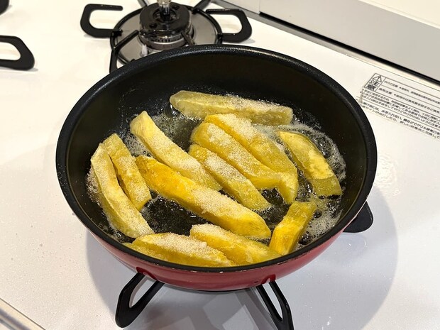 もう一品アレンジ料理として、さつまいもバタースティックを作ってみることに。筆者は冷凍のさつまいもスティックにバターと砂糖を加え、加熱しました。