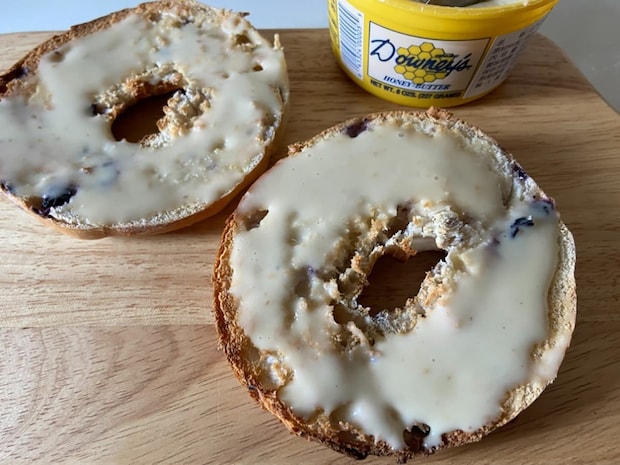 アレンジとして、スライスしたベーグルをトースターで約2分焼き、ハニーバターを塗ってみました。周りはサク、中はもっちりのベーグルに、ハニーバターの甘さが染みわたって相性は抜群!