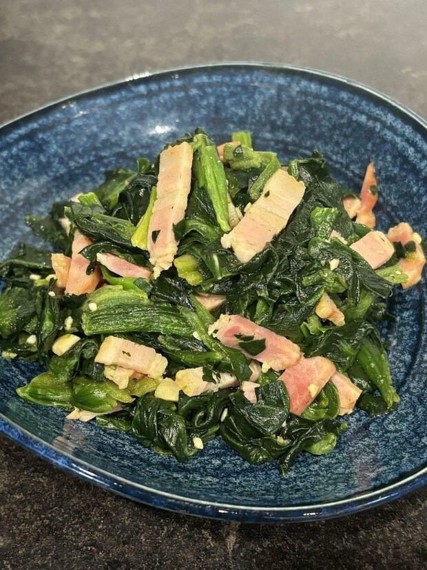 他にも、ほうれん草のベーコン炒めを作ってみました。オリーブオイルとほうれん草の相性が抜群で、食材の旨味も際立っています!