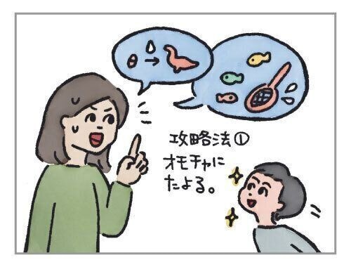 攻略法としては、もう、完全に、オモチャに頼ることにしました。100円ショップで買ってきた、水に入れると恐竜のスポンジが出てくるオモチャ。それから、100円ショップで買ってきた、金魚すくいが楽しめるオモチャ。それから、100円ショップで買ってきた、水鉄砲。その時ブームの遊びをうまく使って、「お風呂で魚釣りしよ〜」とかいうと、入る気になってくれるということを発見。100円ショップさまさまです!