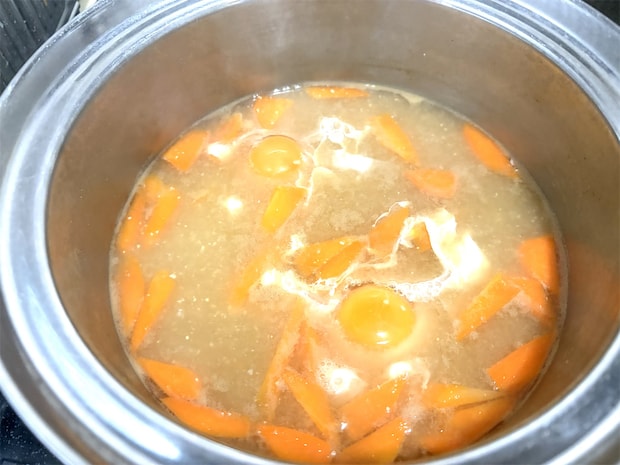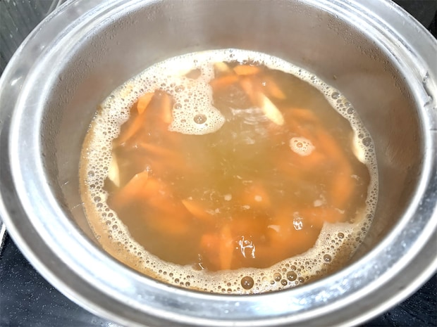 1. 鍋にだし汁を入れて沸騰したら、ごぼうとにんじんを入れて3分くらい煮る。