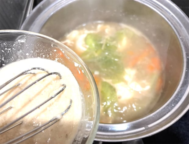 4. やわらかくなった酒粕に、鍋のみそ汁を少し加えて溶いて鍋に戻す。卵を壊さないようにやさしく混ぜる。