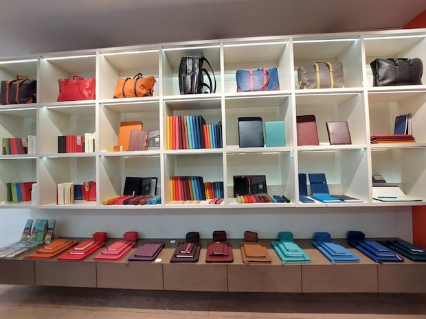 ローマのファブリアーノ・ブティックは、スペイン広場から一直線に伸びるバブイーノ通りにあり、ウィンドウに飾られたカラフルな文具に惹かれて入店する人も多いようです。