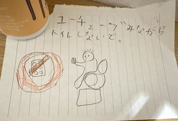 娘さんが作成した張り紙に書かれているのは「ユーチューブ見ながらトイレしないで」という注意書き。あるあるな問題だ…と思わず笑ってしまいました。描かれた物も【誰が見てもわかりやすい】デザインですごいです。便座に座ってスマホを操作している様子も、スマホは禁止というマークも一目見てわかります!