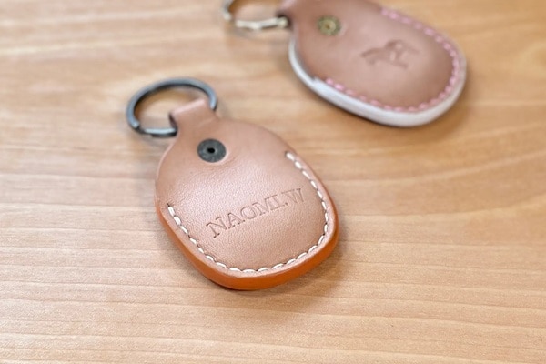 飴色に経年変化するヌメ革を使ったアイテムは、ワンポイントで刻印を入れることができる。