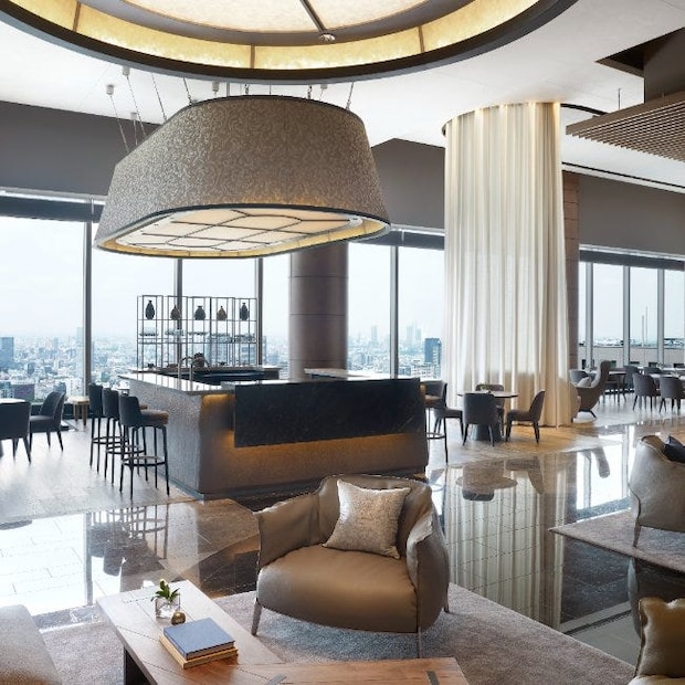 天井から床までの窓一面に緑豊かな皇居の森、そして晴れた日には富士山まで見渡せる絶景が広がる「THE LOUNGE」。ティーソムリエが選ぶ日本茶のセレクションとともに、エグゼクティブペストリーシェフによるスイーツや和の食材を取り入れたセイボリーが美しく盛り付けられたアフタヌーンティー、創造性あふれるパフェやデセール、カクテルタイムなど、時間帯やシーンに合わせて美しい眺望とダイニング体験を楽しめる。