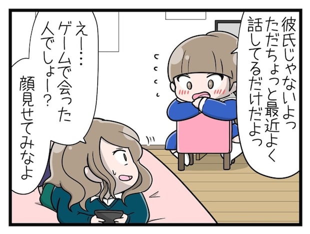 めいさんが「彼氏じゃない」と言っているのは「かい」のことのようです。そんな姉は、ゲームで知り合った相手の顔を見たいと言います。