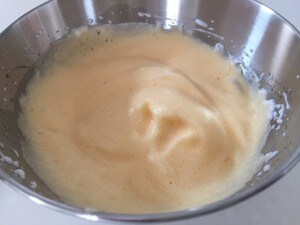 2.メレンゲに、混ぜておいた卵黄を2回に分けて加え、軽く混ぜます。