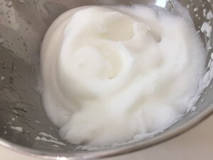 1.卵白と卵黄に分け、まず卵白を泡立てメレンゲを作ります。卵黄のほうには牛乳、砂糖を加えて混ぜます。