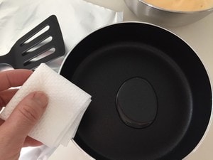 3.そして、いよいよ焼く工程へ。フライパンにキッチンペーパーで油を敷き、フライ返しの両面も油で拭いておきます。