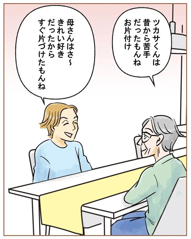 ツカサしか散らかさない汚い部屋を見て、義母に叱られたのは私。義母には、片付けないツカサに文句を言うつもりは全く無いようです。それどころか「ツカサくんは昔から苦手だったもんね、お片付け。」と、認めているような言い方。「母さんはさ~、きれい好きだったからすぐ片付けたもんね」とツカサも笑顔です。すぐ片付けるってこと、ツカサは分かってるんだな。気づいていないのではなく、すぐに片付けている母親をちゃんと見てるんじゃない。