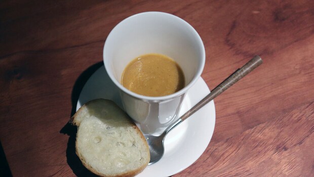宮城県産の「アカエイ」を使った濃厚な魚のスープ。アカエイは、市場にあまり出回らない「低利用魚」ですが、実はコラーゲンが豊富で非常に美味しい魚です。海の環境保全に取り組む生産者から直接仕入れたという、サステナブルな想いも込められています。