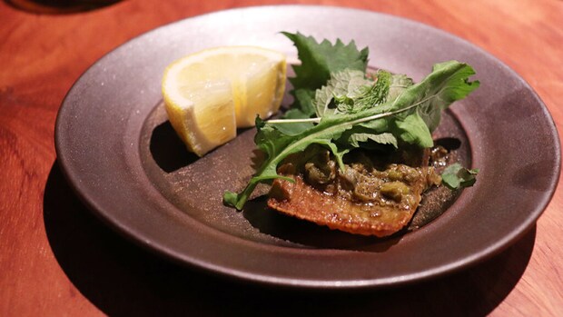 スープと同じアカエイを、今度はムニエルで。丁寧に火入れされた身はふっくらと、そして特徴的な軟骨のコリコリとした食感が楽しい一皿です。