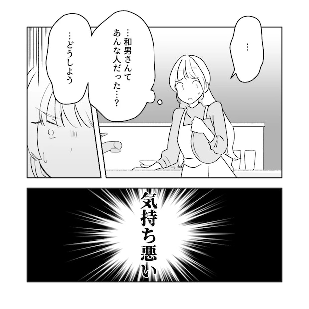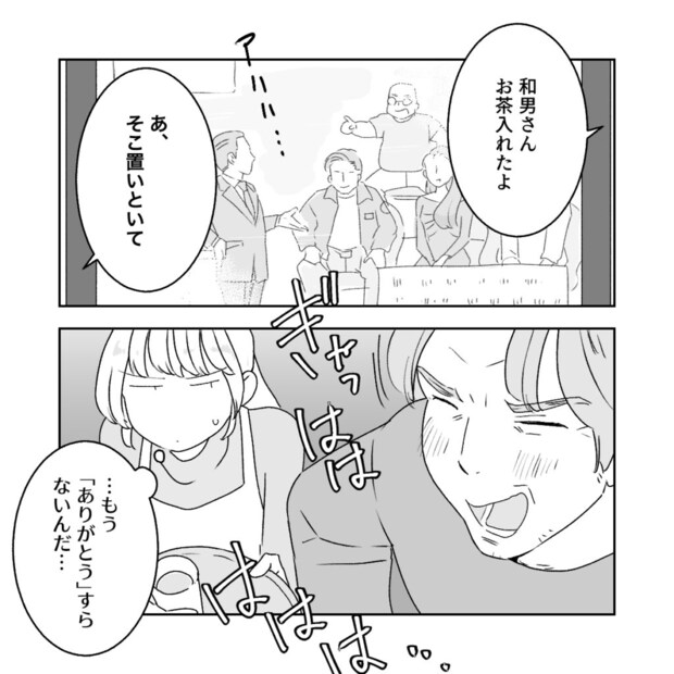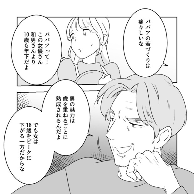 家事はすべて私の担当で、和男さんは文句を言うだけ。思い描いていた結婚生活はどんどん崩れていきます。年上の王子様だと思っていた和男さんがただのおじさんに見えてきた私は、現実と向き合わざるを得ないように。私がお茶を淹れても「そこに置いておいて」と言うだけで「ありがとう」すら言わなくなった和男さん。お笑い番組をみて大笑いしています。