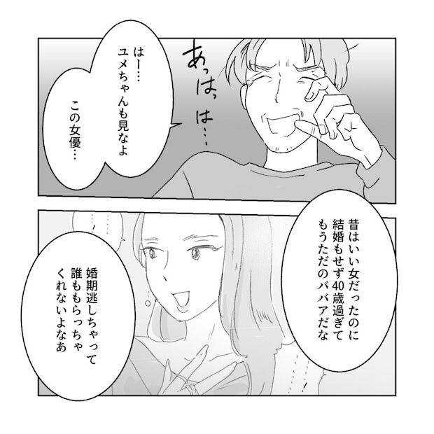そして、「はー・・・ユメちゃんも見なよ」と私に声をかけたかと思えば、テレビに映った俳優さんを見て「昔はいい女だったのに結婚もせず、40歳過ぎてもうただのババアだな。婚期逃しちゃって誰ももらっちゃくれないよなぁ」と突然の女性軽視発言。
