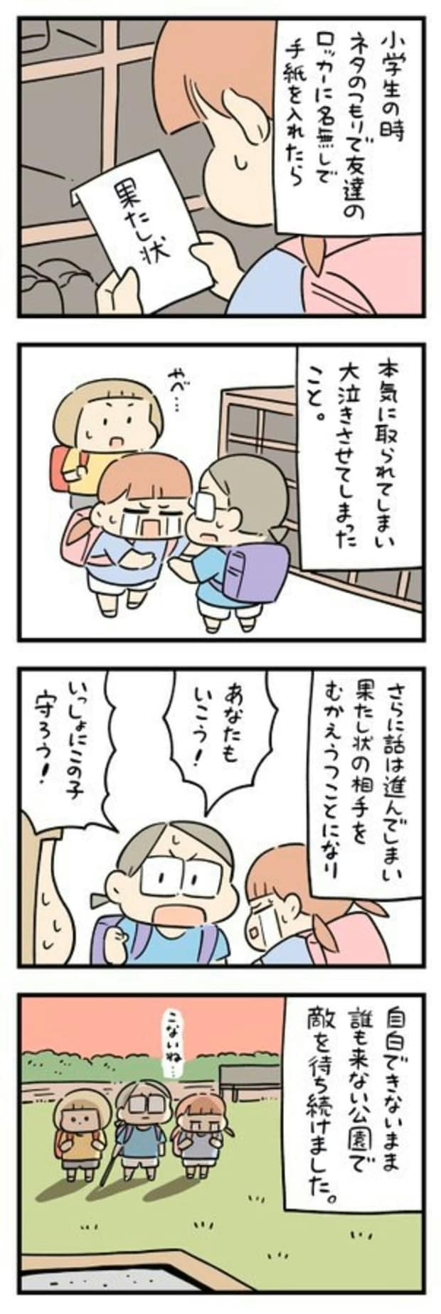 人々の体験談の漫画を描かれているしろやぎ秋吾さんの、「今だから謝りたい事」その6をご紹介します。小学生のときにただのネタのつもりで、友達のロッカーに「果たし状」を入れてしまい…。