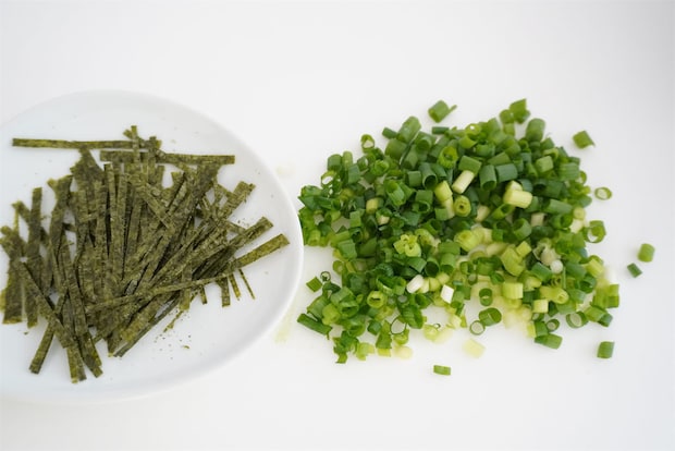 1. 青ねぎは小口切りにし、のりは刻み、卵は溶きほぐす。